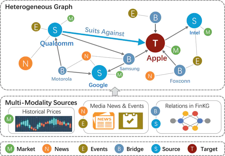 Financial time series analysis plays a central role in hedging market risks and optimizing investment decisions. This is a challenging task as the problems are always accompanied by multi-modality streams and lead-lag effects. For example, the price movements of stock are reflections of complicated market states in different diffusion speeds, including historical price series, media news, associated events, etc. Furthermore, the financial industry requires forecasting models to be interpretable and compliant. Therefore, in this paper, we propose a multi-modality graph neural network (MAGNN) to learn from these multimodal inputs for financial time series prediction. The heterogeneous graph network is constructed by the sources as nodes and relations in our financial knowledge graph as edges. To ensure the model interpretability, we leverage a two-phase attention mechanism for joint optimization, allowing end-users to investigate the importance of inner-modality and inter-modality sources. Extensive experiments on real-world datasets demonstrate the superior performance of MAGNN in financial market prediction. Our method provides investors with a profitable as well as interpretable option and enables them to make informed investment decisions.